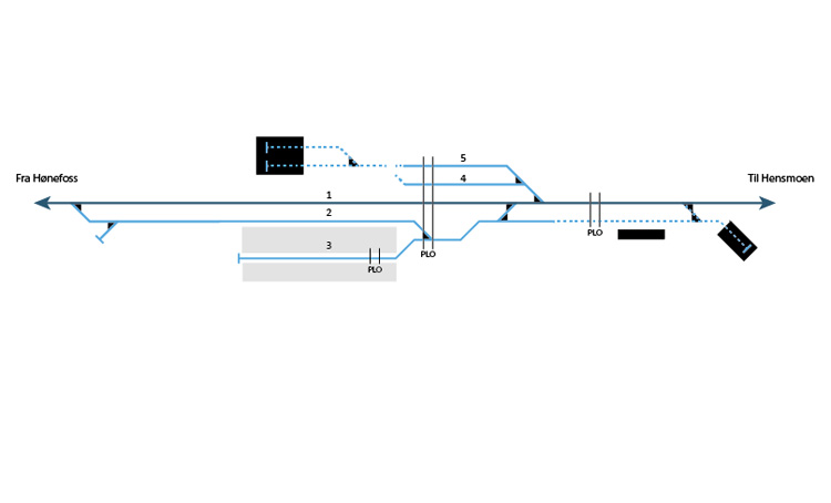 *) Spor 2 strekker seg forbi tømmerterminalene til lagrene syd for terminalen. Sporets lengde er derfor større enn lengden av lastegaten til sporet.