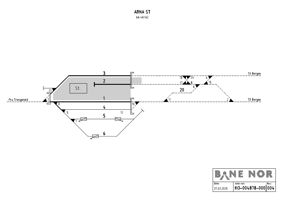 Skjematisk sporplan for Arna stasjon som viser spor og spornummer.