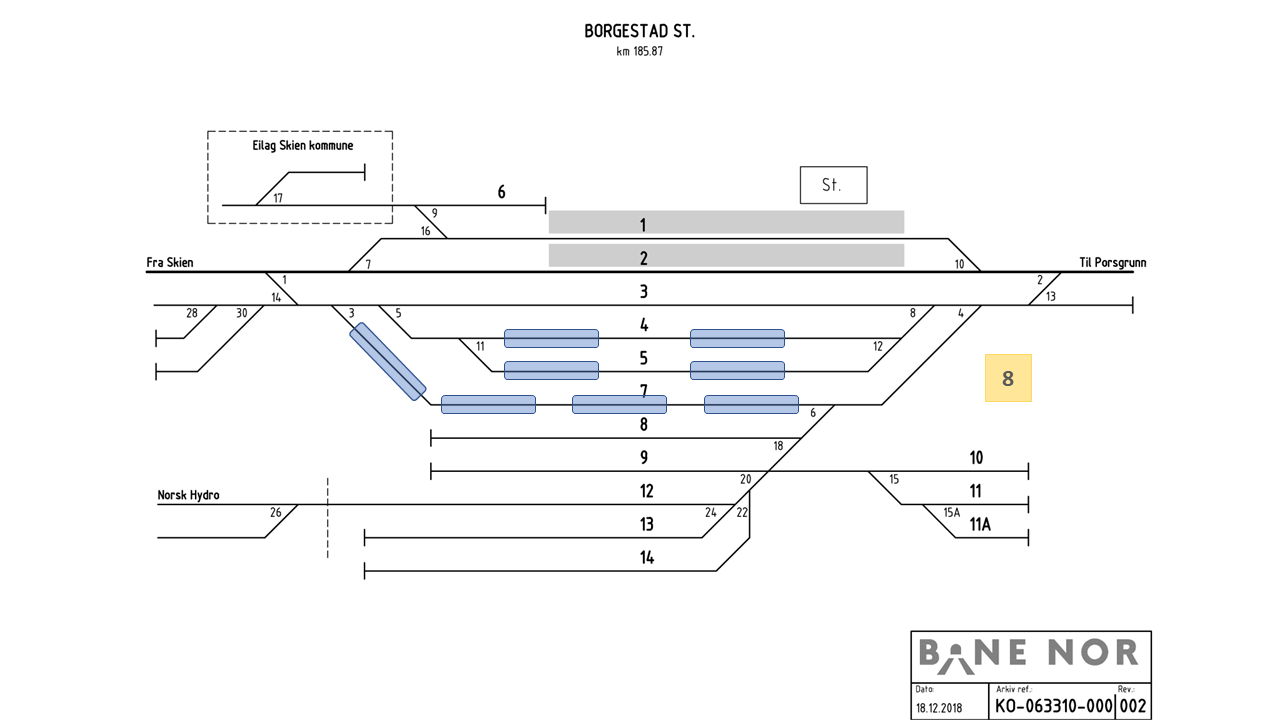 KL-anlegg | Serviceplattform | Sportilgang med bil | Toalettømming til stasjonært anlegg | Vannfylling | Togvarme | Tog-vaskemaskin | Dieselanlegg | Bremseluft | Merknader |