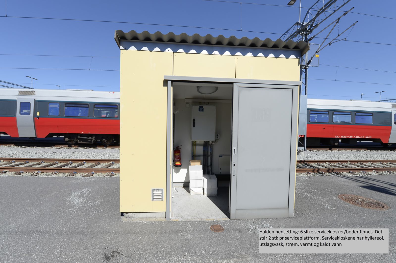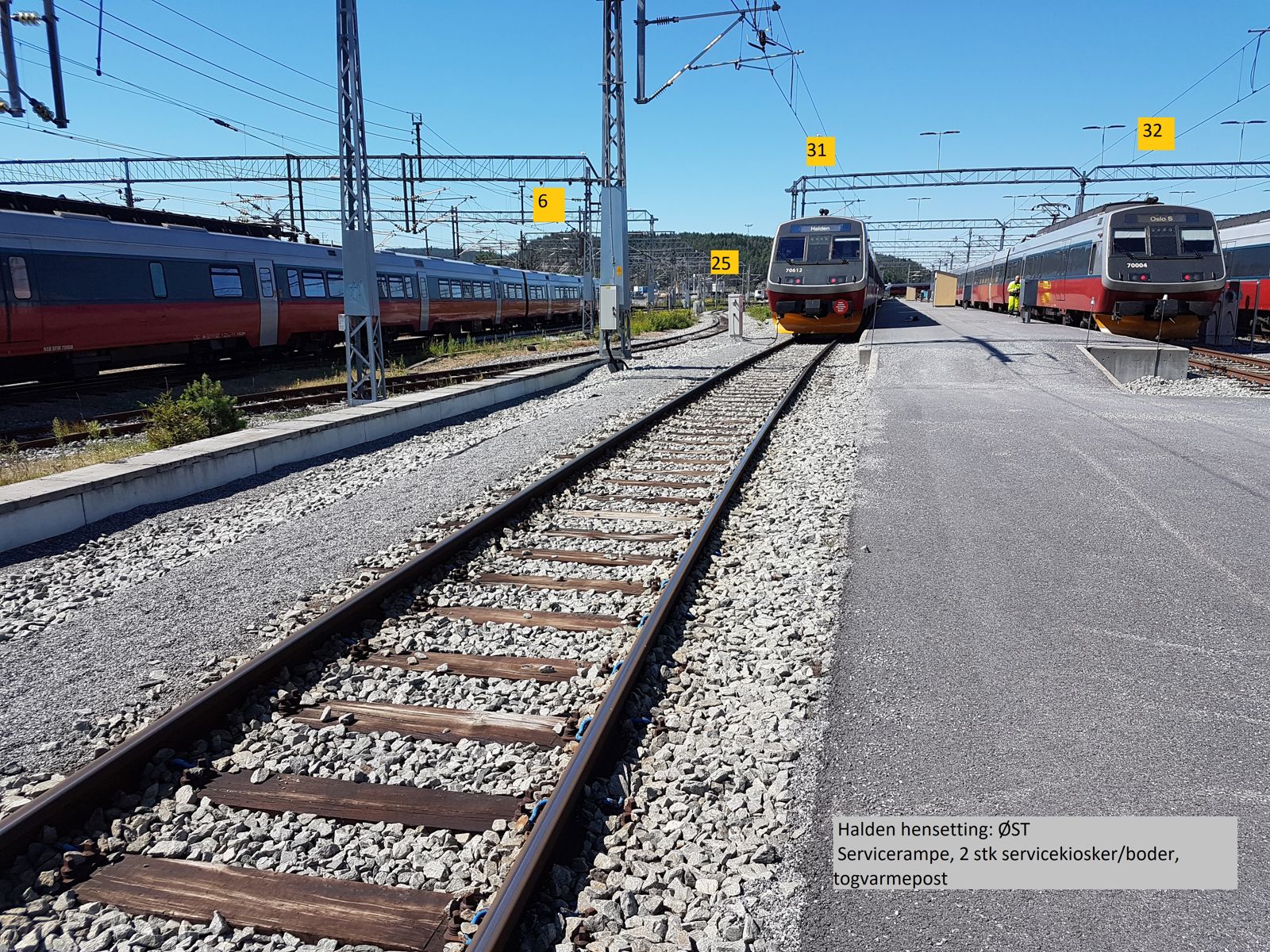 KL-anlegg Serviceplattform Sportilgang med bil Toalettømming til stasjonært anlegg Vannfylling Togvarme Tog-vaskemaskin Dieselanlegg Bremseluft Merknader