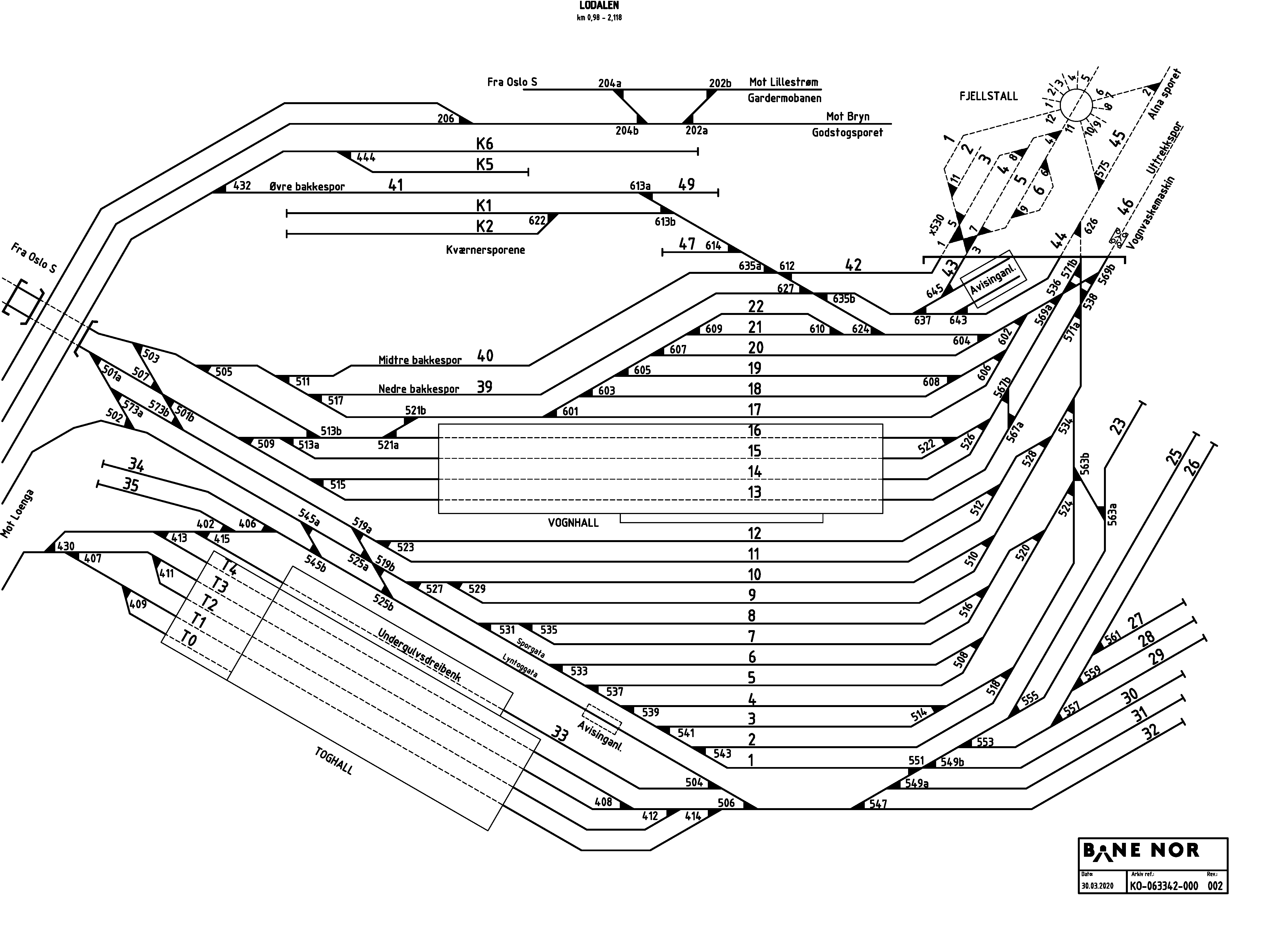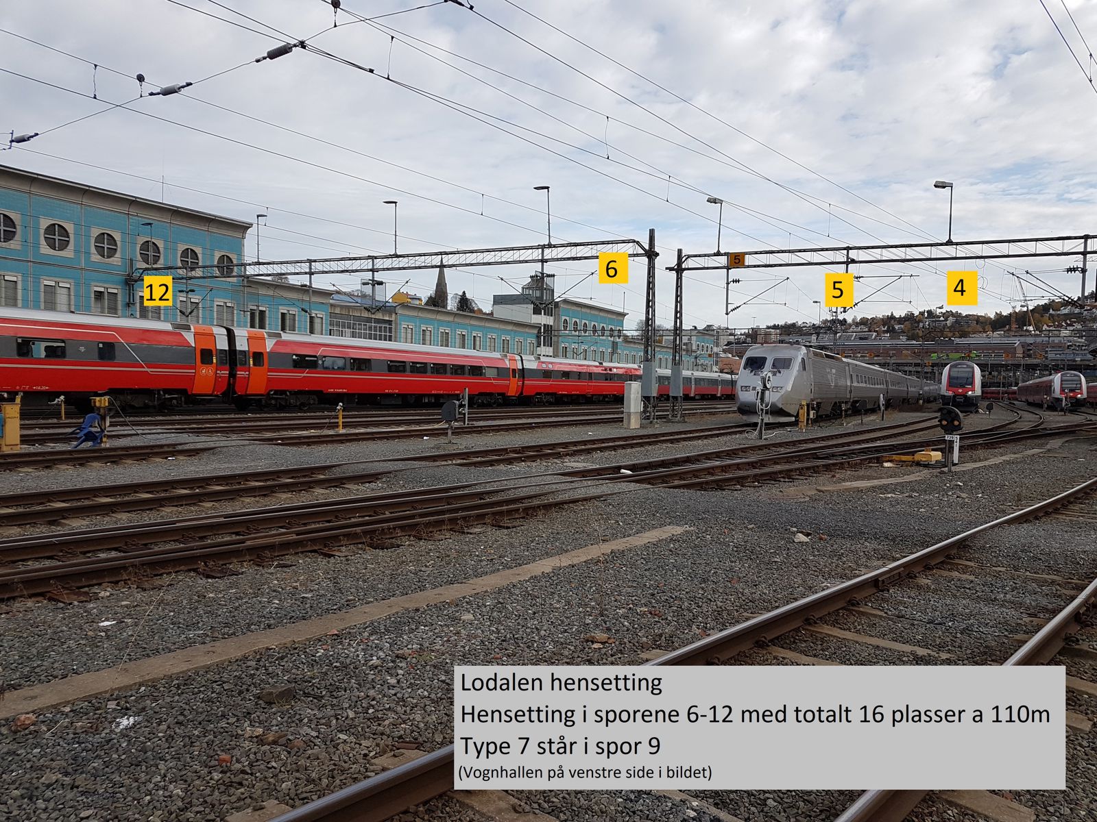 KL-anlegg | Serviceplattform | Sportilgang med bil | Toalettømming til stasjonært anlegg | Vannfylling | Togvarme | Tog-vaskemaskin | Dieselanlegg | Bremseluft | Merknader |
