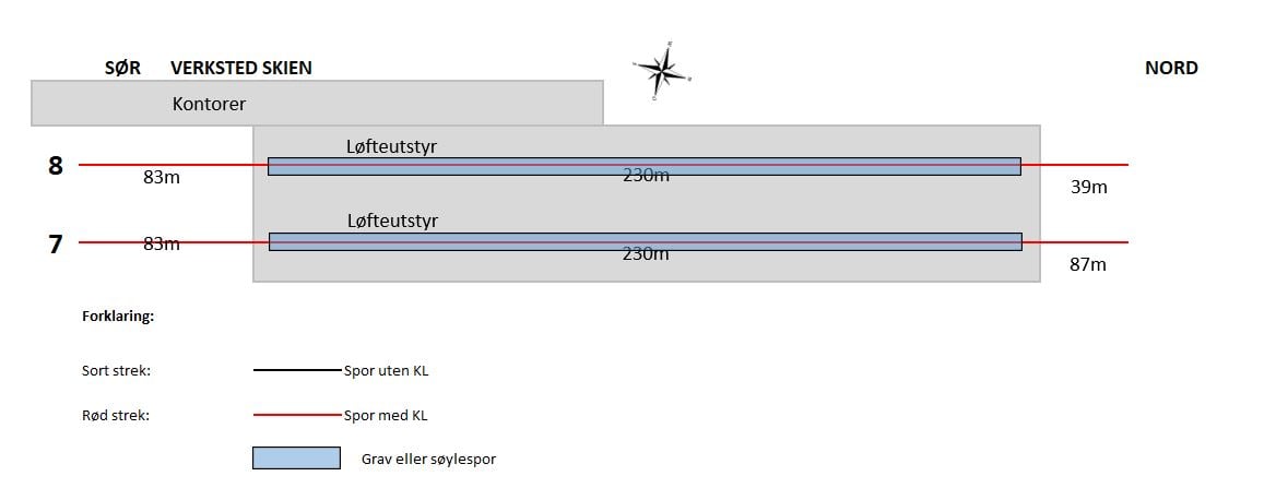 | Bygning | Spor- nummer | Total sporlengde (m) | KL-anlegg | Gravlengde (m) | Løfteanlegg | Tilgang til takkontroll | Travers-kran/løftebukk | Tine/tørke | Toalettømme-anlegg | Vann-fylling | Togvarme | Tog-vaskemaskin | Kadaver-sanering | Togvekt | Medie-anlegg | Hjul-dreiing | Lakkerings-anlegg | Trykkluft | Merknader |