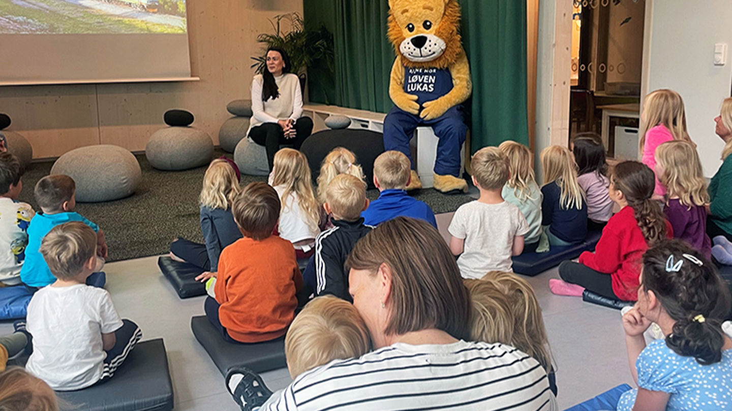 Når Løven Lukas kommer for å snakke om sikkerhet ved jernbanen, blir det både smil, latter og alvor i Ranheimsfjæra barnehage.