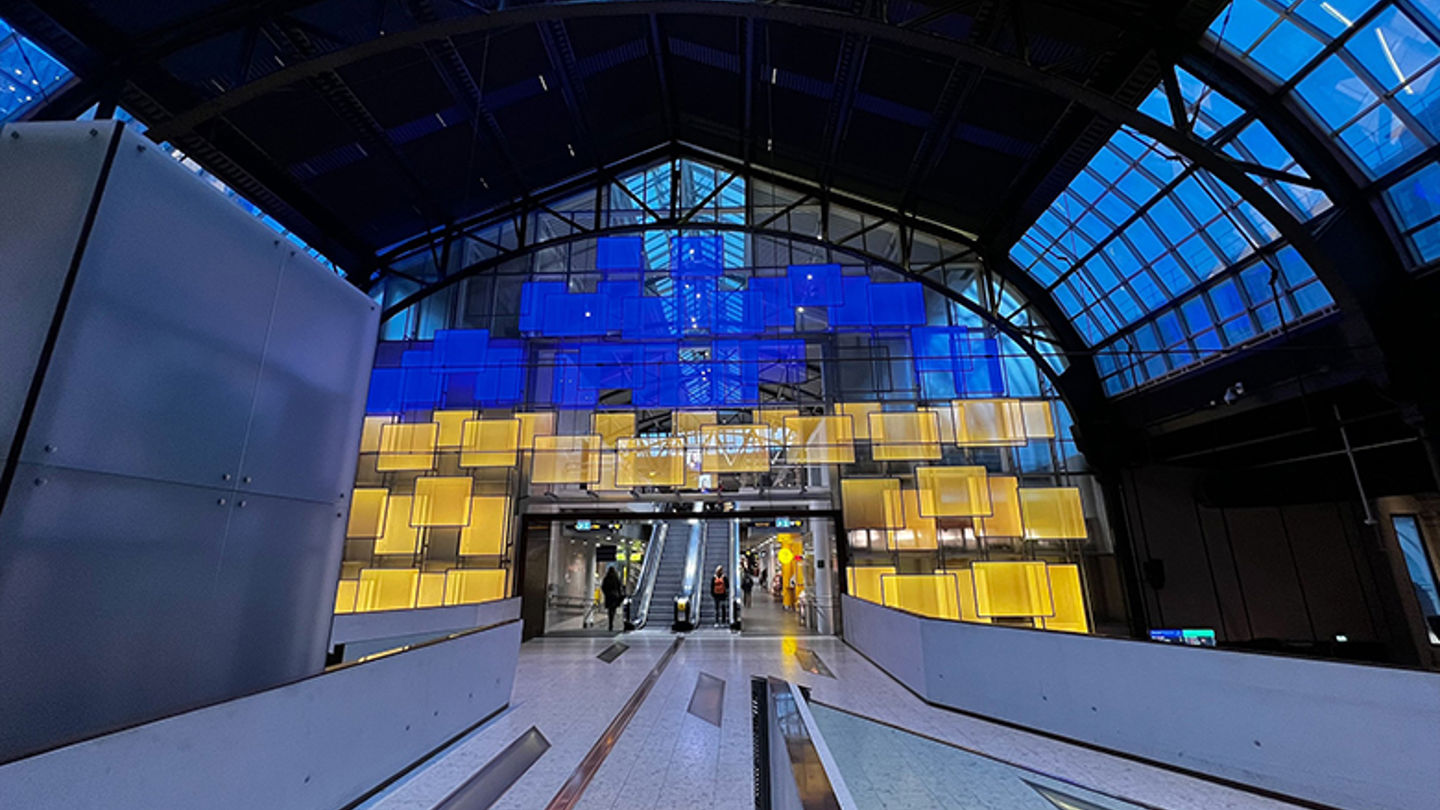 Hele jernbanefamilien i Europa mobiliserer. Onsdag lyssatte vi Østbanehallen på Oslo S for å markere solidaritet og støtte til det ukrainske folk.