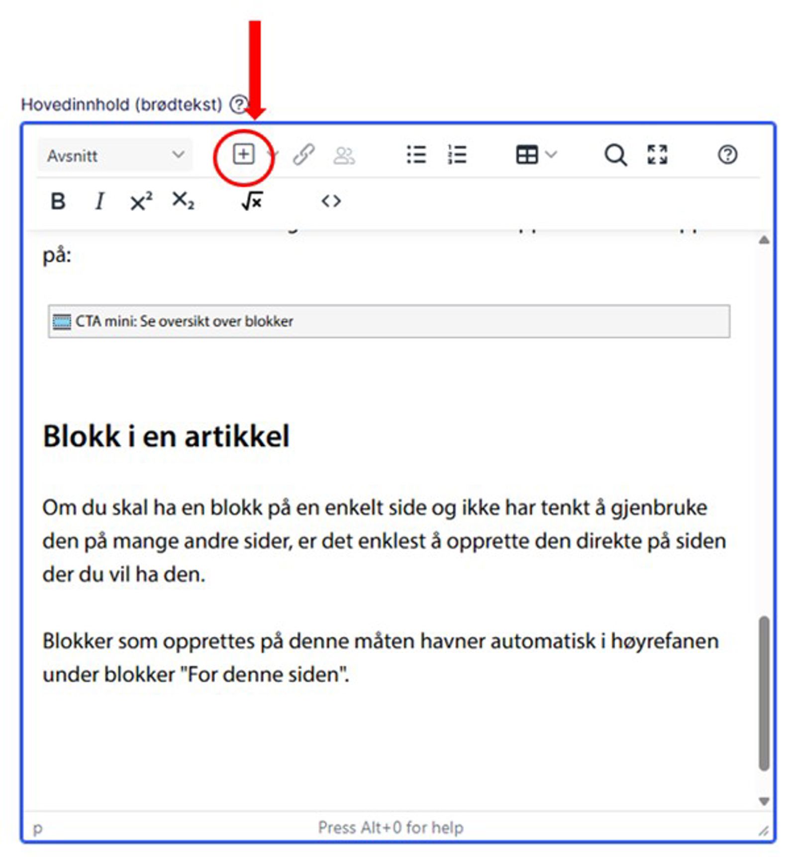Plasser markøren der du vil ha blokken i i feltet "Hovedinnhold (brødtekst) og klikk på plusstegnet.