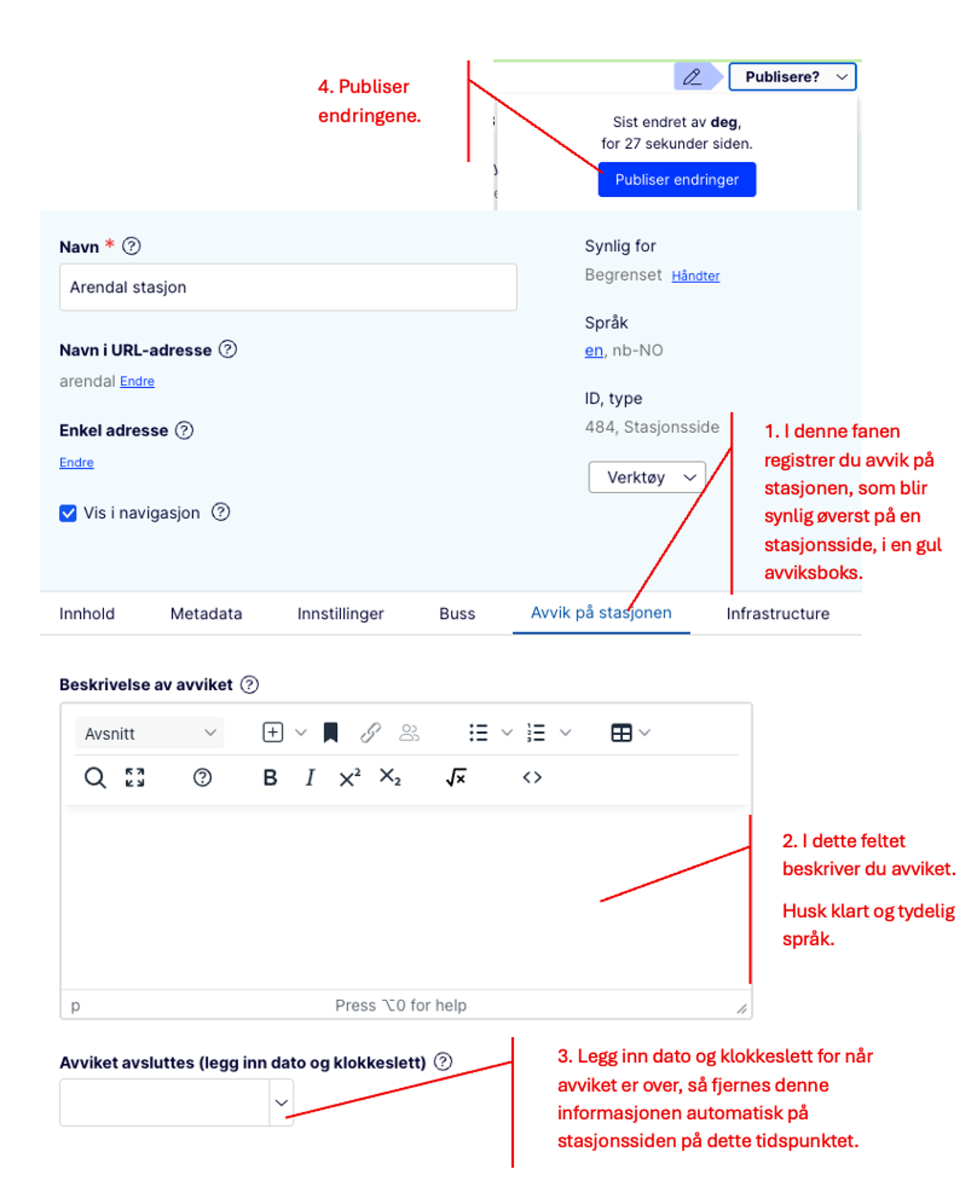 Da blir avviket automatisk avpublisert, og stasjonssiden vil se lik ut som før du registrerte avviket.