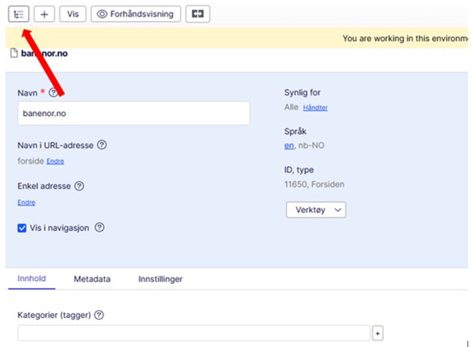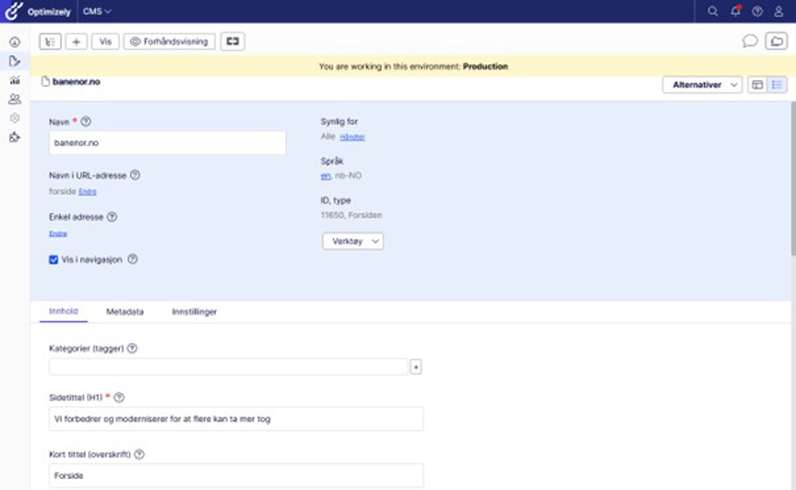 Første møtet med publiseringsverktøyet, her vist med forsiden til banenor.no som eksempel. Disse innholdsfeltene kan være grå og låst for redigering, avhengig av tilgangsnivået ditt.