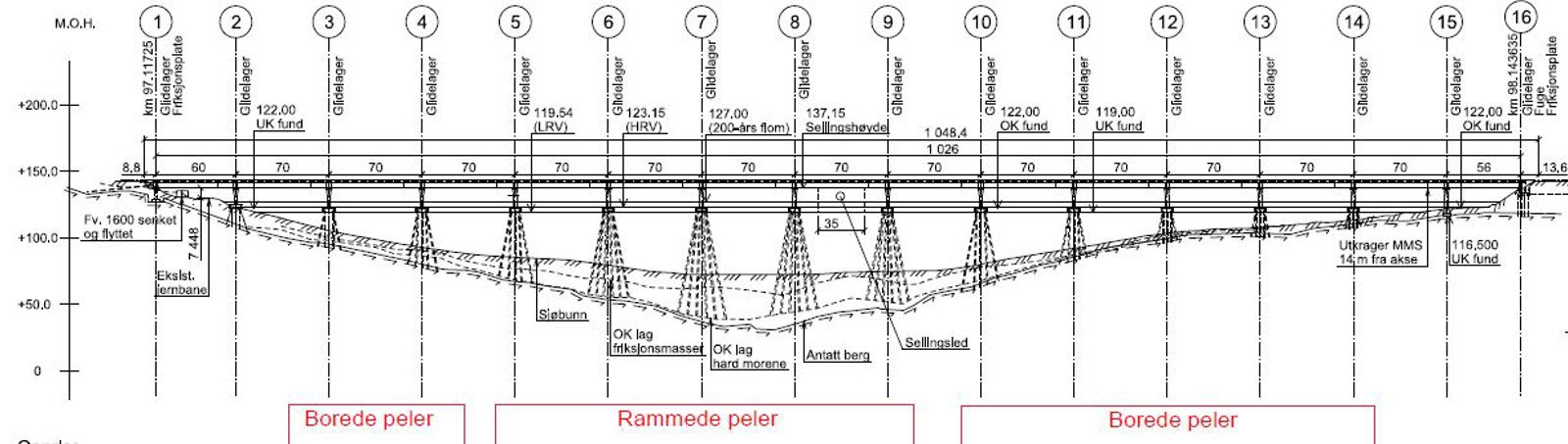 Akse 1 støpes på land, mens akse 2 blir støpt direkte på bunnen med borede/stålkjernepeler. Dette blir gjort senere, og vi vil komme nærmere tilbake til dette.