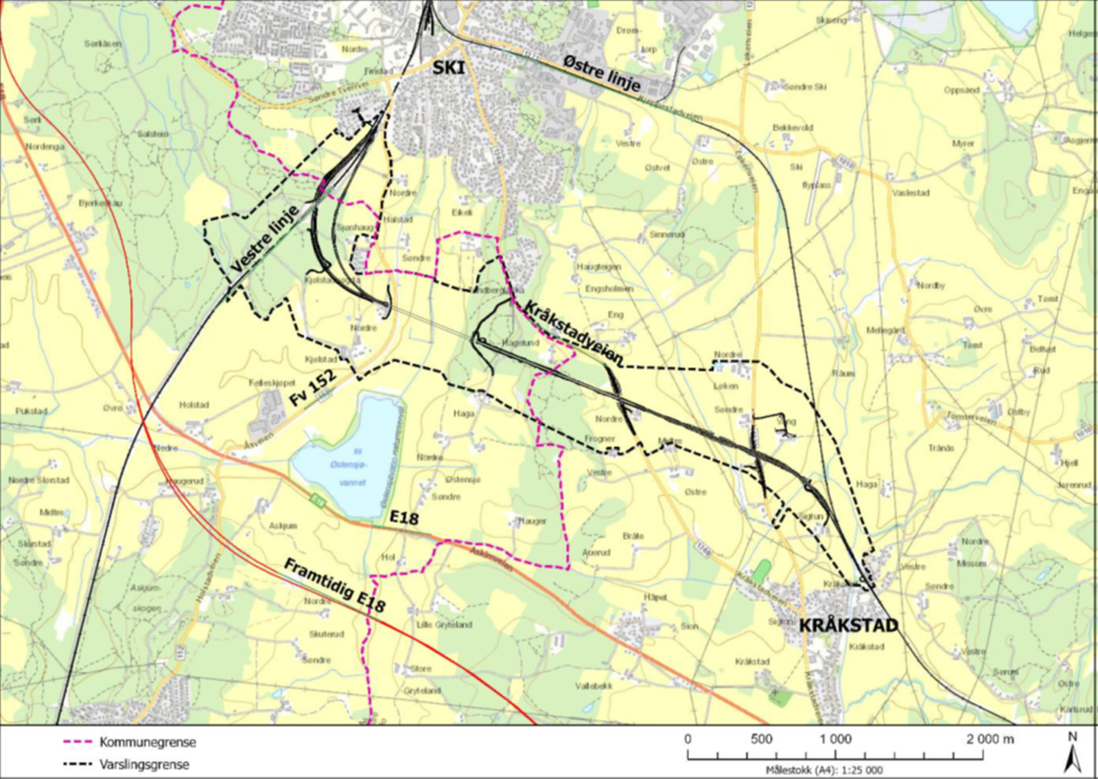 Prosjektet Ny avgrening Østre linje skal bygge en ny påkobling mellom Østfoldbanens Østre og Vestre linje ved Ski stasjon, samt bygge 5 km nytt dobbeltspor mellom Ski og Kråkstad. Planarbeidet har pågått i en årrekke, og forslaget til reguleringsplan ble sendt til behandling i Kommunal- og distriktsdepartementet i november 2023. Vi venter på klarsignal fra departementet til å legge planen ut på høring og offentlig ettersyn.