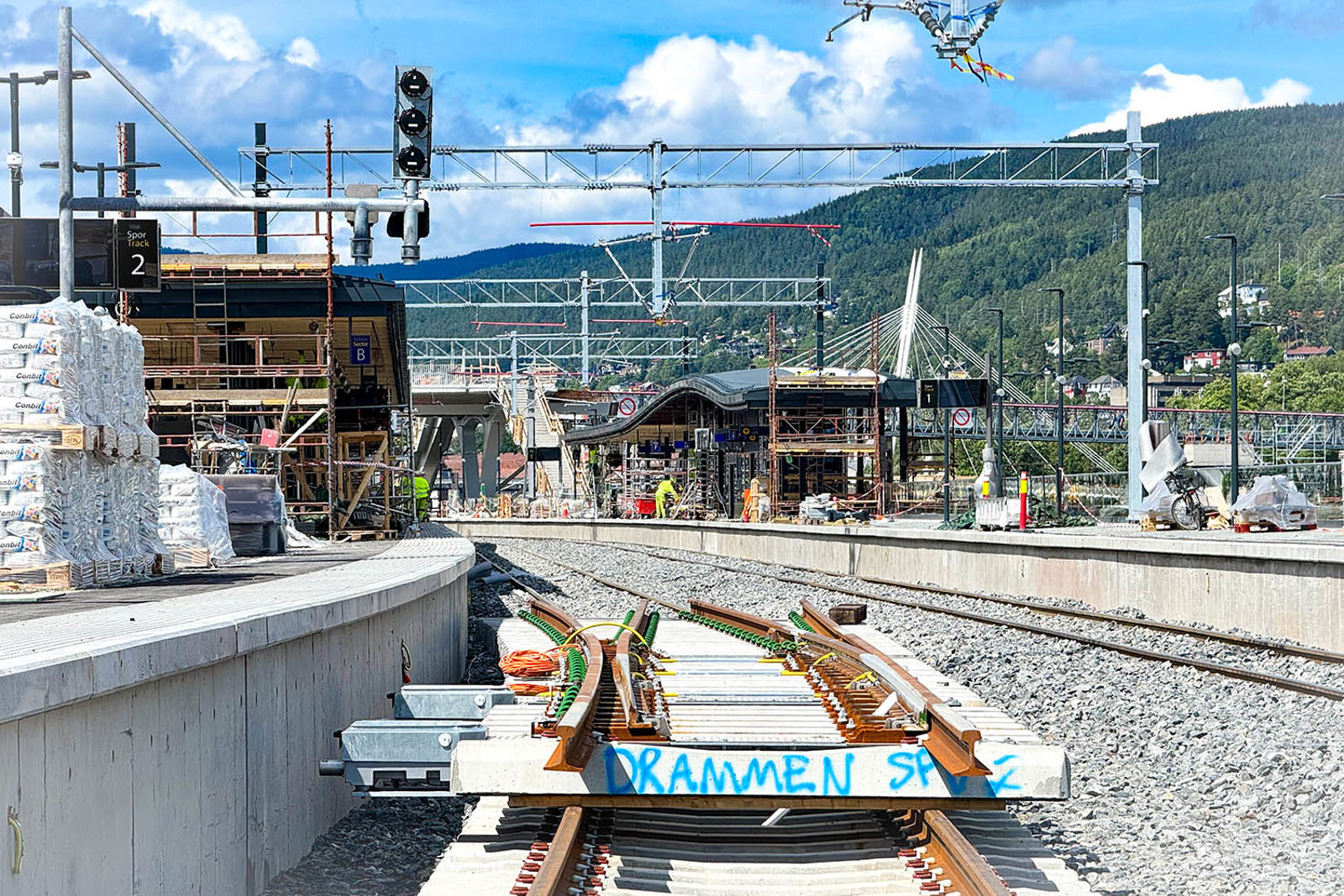 På den nybygde delen av Drammen stasjon, med de tre sporene som skal tas i bruk etter sommeren, skal vi blant annet heise på plass en del åk og master. I løpet av helgen skal vi også heise inn rekkverk til bybru. Det blir ellers trekking av kabler, arbeid med sporveksler og forberedelser til den lange perioden med stans i togtrafikken 29. juni-29. juli.