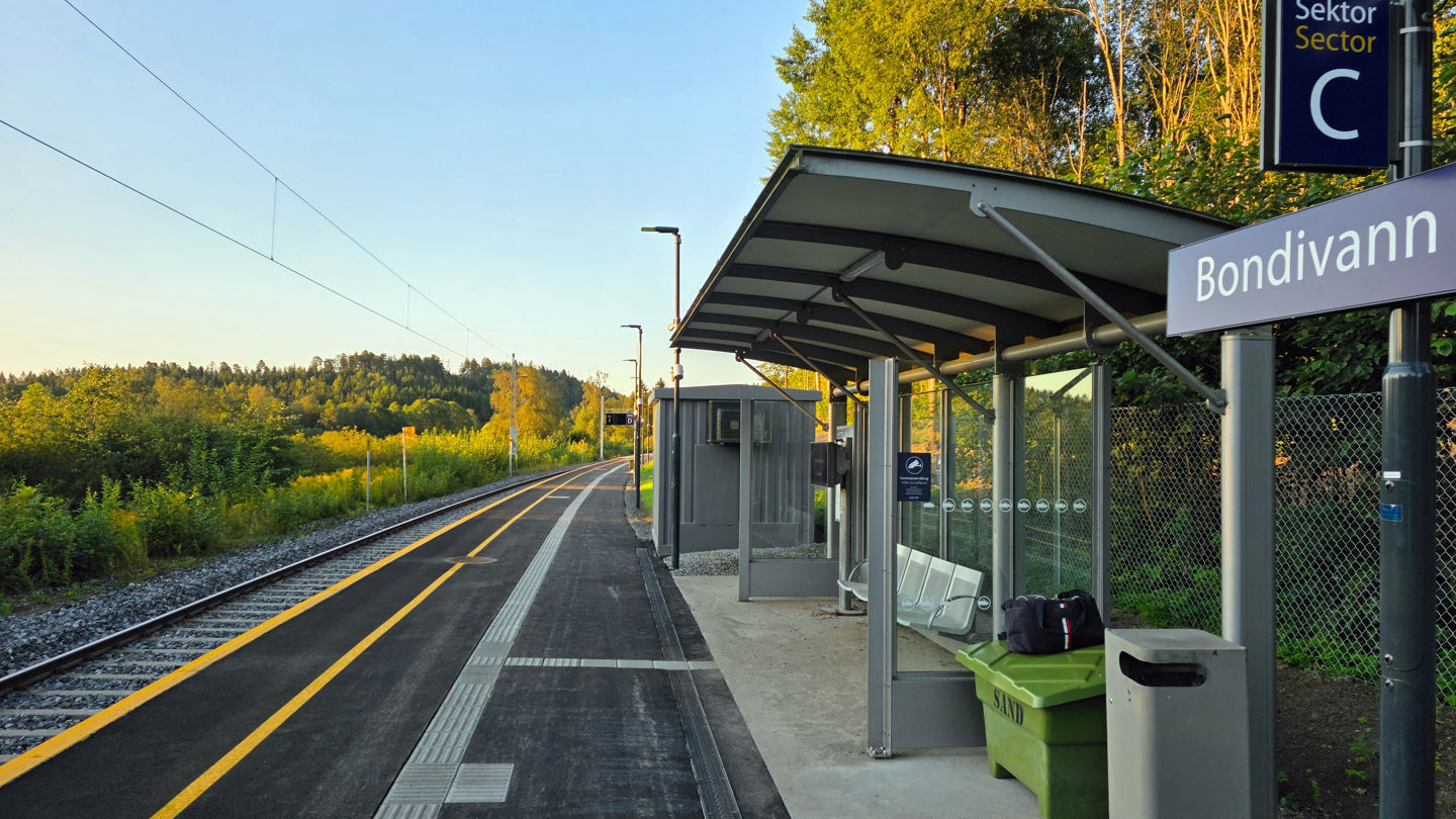 Plattformen på Bondivann er forlenget. Nå er holdeplassen klar for nye, lengre togsett som skal settes i trafikk på Spikkestadbanen.