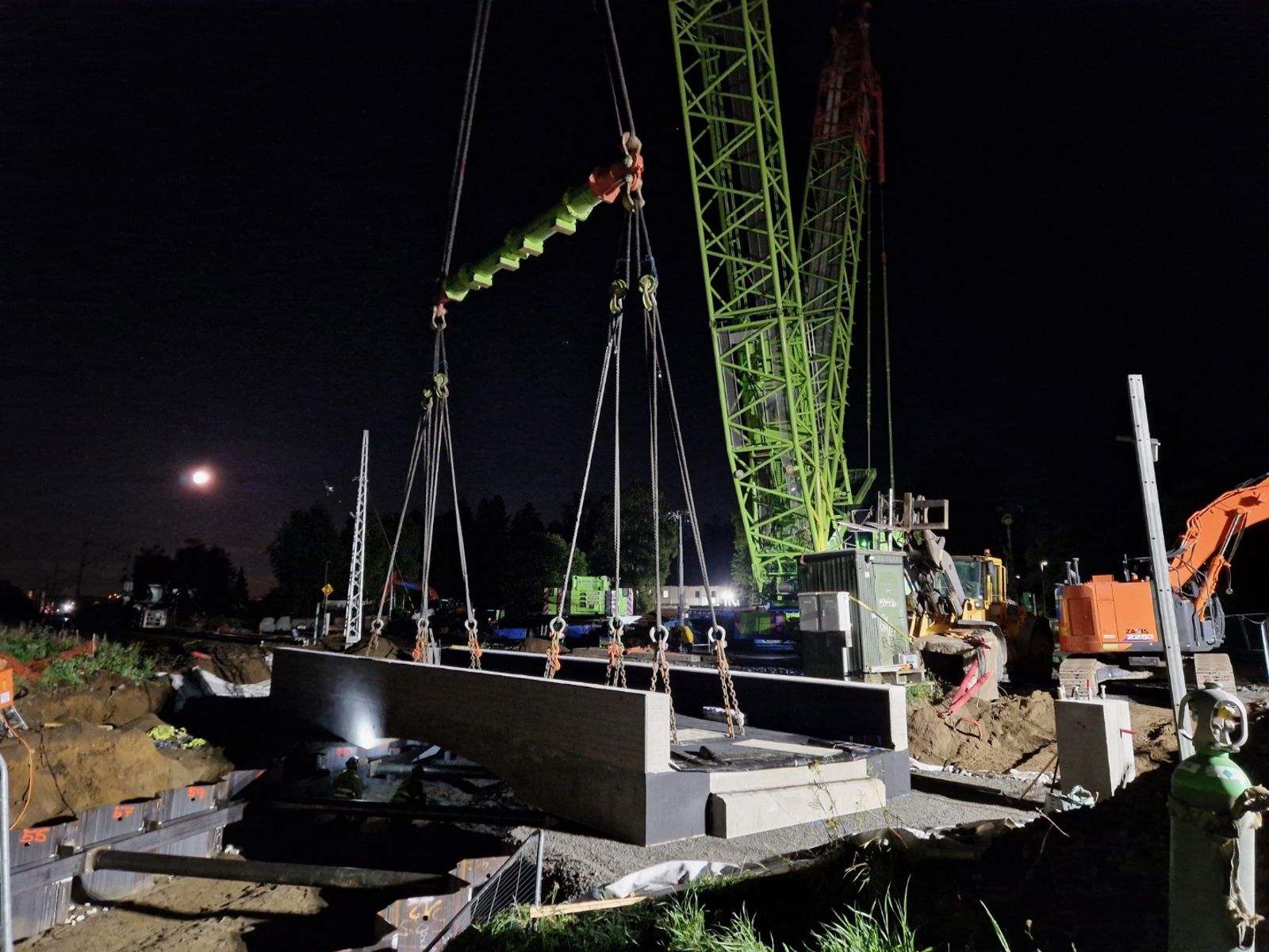Da arbeidsperioden startet fredag kveld, ble sporet gravd over og spuntvegger av stål ble presset ned i grunnen der undergangen skal komme. På forhånd var ei bruplate på 200 tonn støpt ferdig på stedet, og natt til mandag 19. august ble denne løftet på plass.