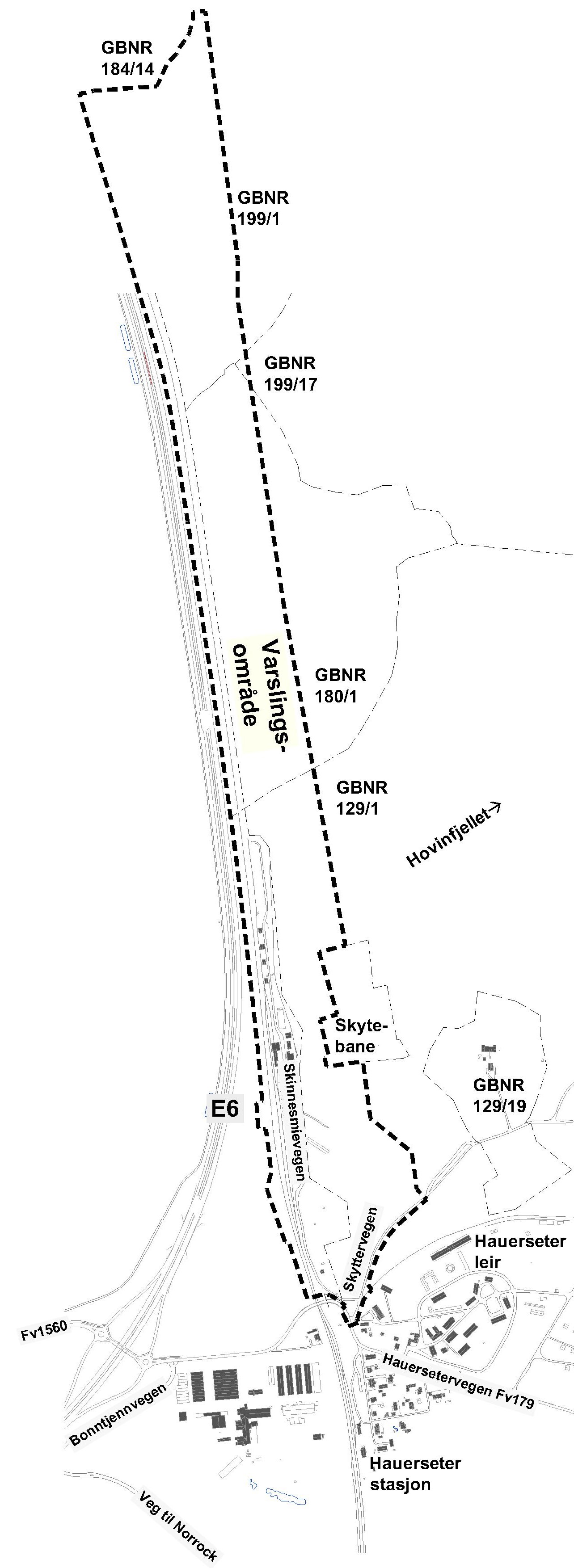 Planområdet omfatter i hovedsak eiendommene til Ullensaker kommune, en privat grunneier, Statskog og Bane NOR. Sør i planområdet omfattes deler av eiendommene til Forsvarsbygg (Hauerseter leir) og fylkeskommunen (fv.179). Det planlegges et fortau på østsiden av Skyttervegen og forbi Skinnesmievegen.