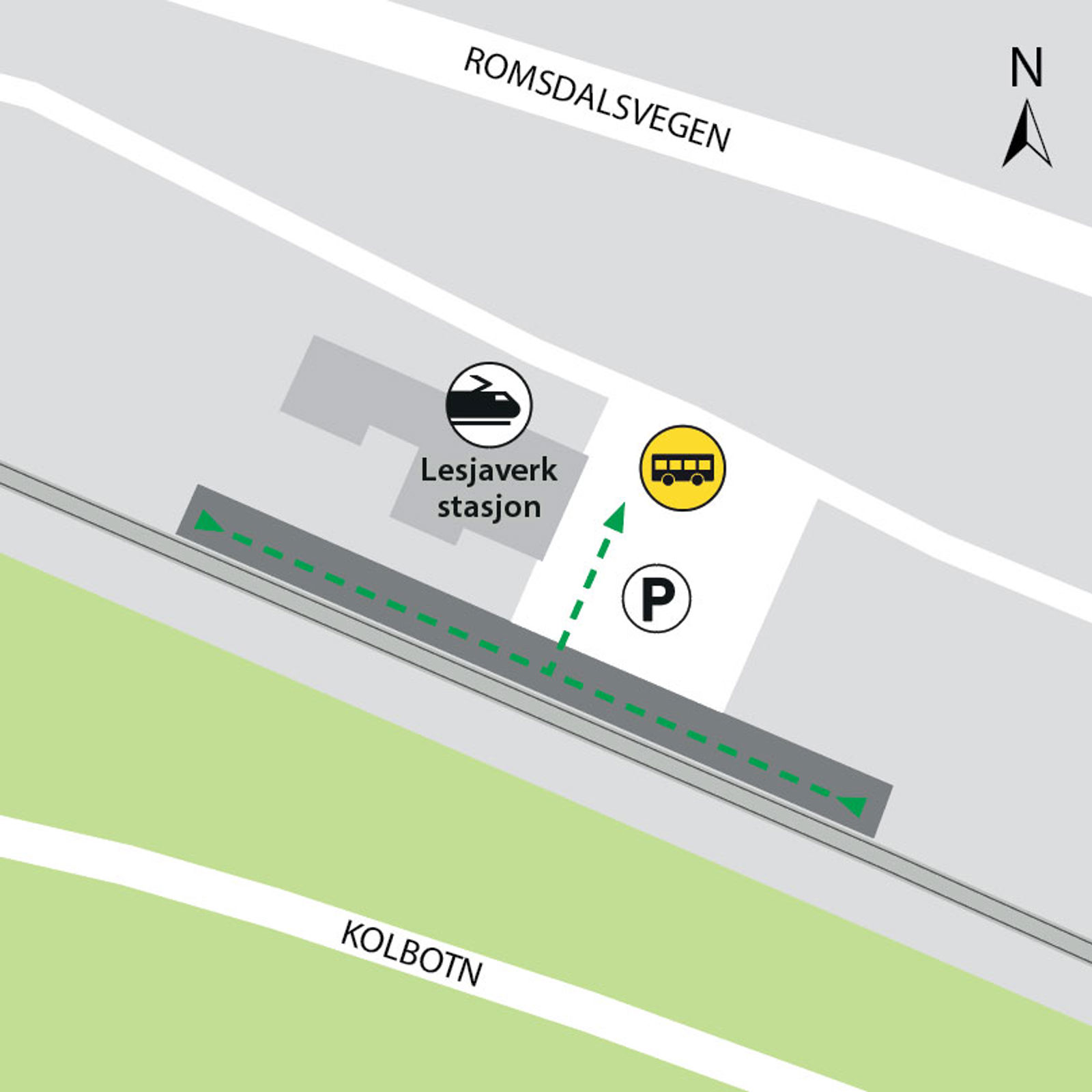 Lesjaverk stasjon ligger på Raumabanen. Herfra kan du ta toget mot Åndalsnes, Dombås, Oslo, Trondheim og Hamar.