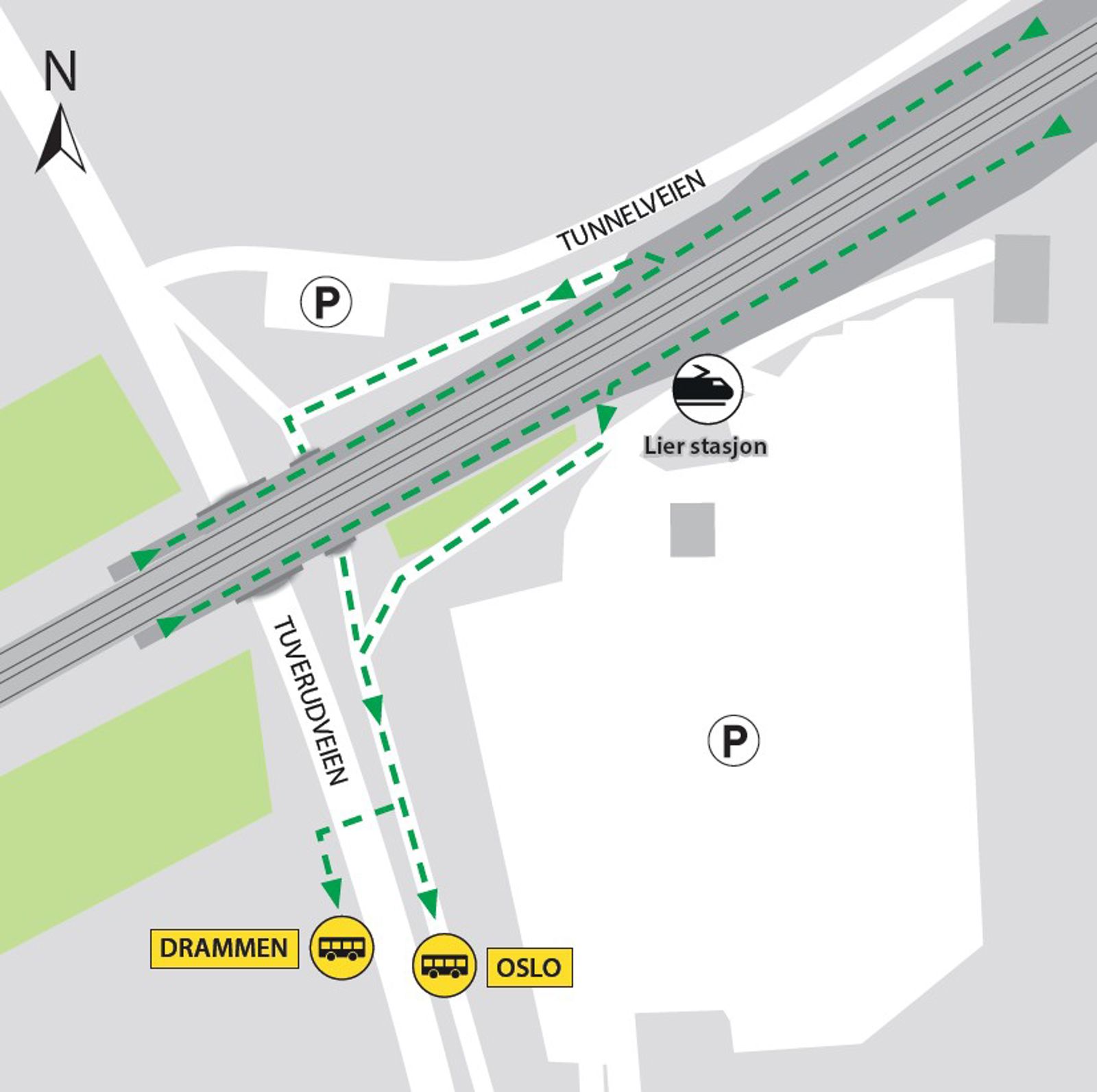 Bussene kjører fra bussholdeplassene Lier stasjon i Tuverudveien.