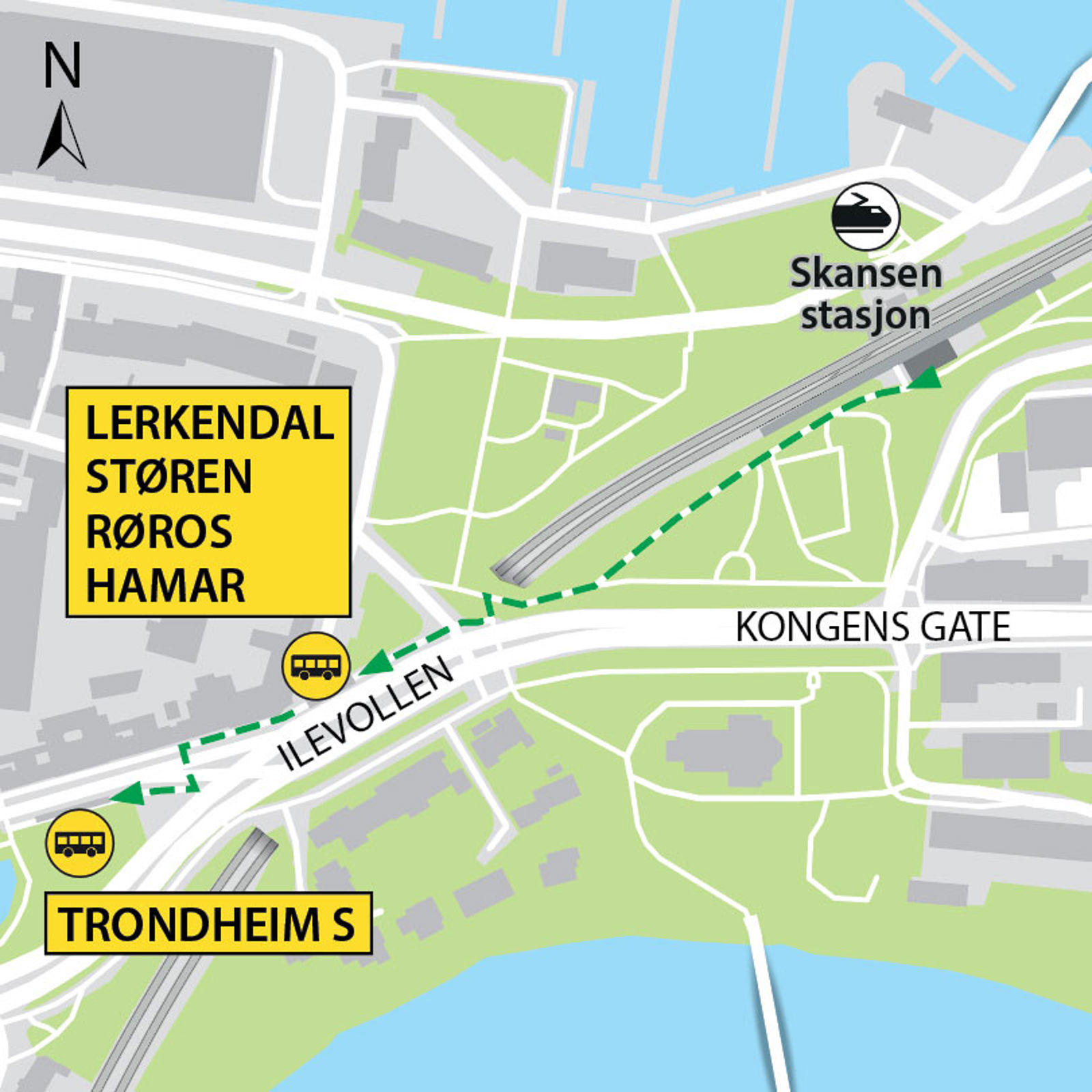 Bussene kjører fra bussholdeplassene Skansen i Ilevollen. Gangavstand til holdeplassene er ca. 250-350 meter.